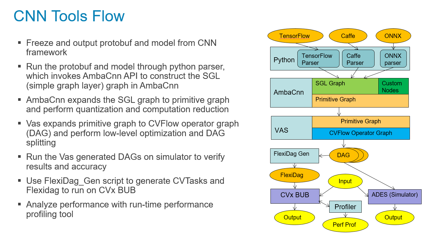 To make programming as easy as possible for our customers, we dedicated significant time and resources to the development of our CVflow compiler and network mapping tool (CNNGen), constructing a tool stack that reads a high-level specification of a network in TensorFlow or PyTorch and optimizes the network to run on our hardware, while simultaneously providing enough control so that the user achieves nearly the same level of accuracy as their original high-precision networks. This tool stack, built on top of our CVFlow architecture, is powerful enough to extract the best performance from the device, yet also flexible enough to be integrated into external services such as Sagemaker NEO from Amazon Web Services, which allows customers to adapt their architectures and networks to our hardware on the cloud.